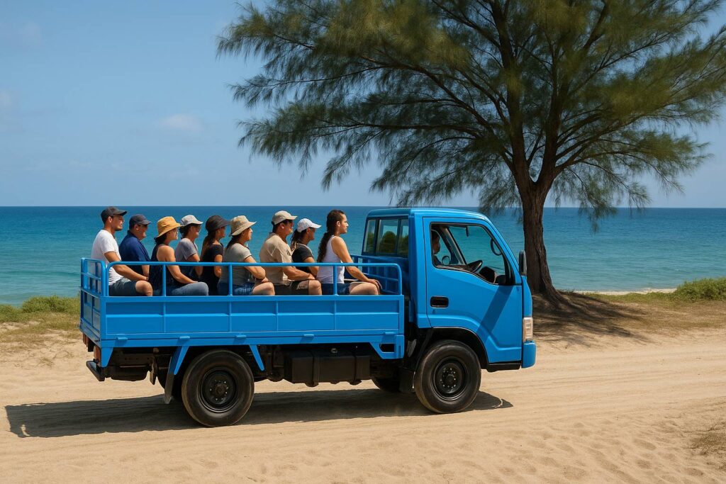 Bayangin aja, mobil pick-up modifikasi dengan bangku panjang di baknya. Kita naik dari parkir ke bibir pantai, tapi jalurnya bukan aspal—itu murni pasir. Kadang lembut, kadang keras, kadang miring.