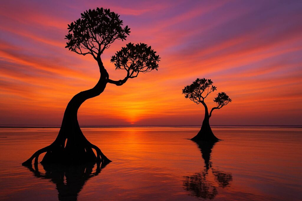 Yang bikin spesial: refleksi air pasang surut. Pas air surut, genangan tipis di sekitar akar pohon jadi cermin alami. Kombinasi siluet + refleksi ini yang bikin foto terlihat surreal. Bukan cuma soal matahari terbenam, tapi soal timing pas antara cahaya, air, dan formasi pohon.